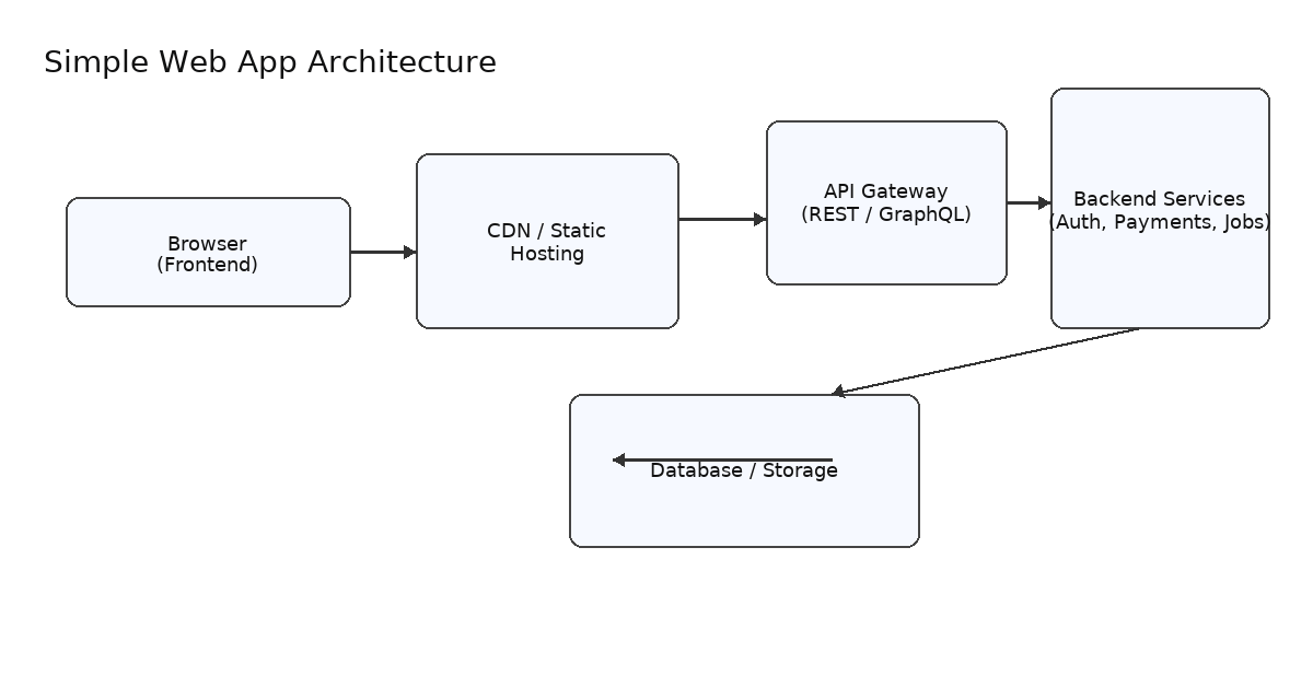At a high level: browser → API → backend services → database. For production, add CDNs, API gateways, auth providers, monitoring, and backups. Cloud providers have well-documented patterns for this layout.